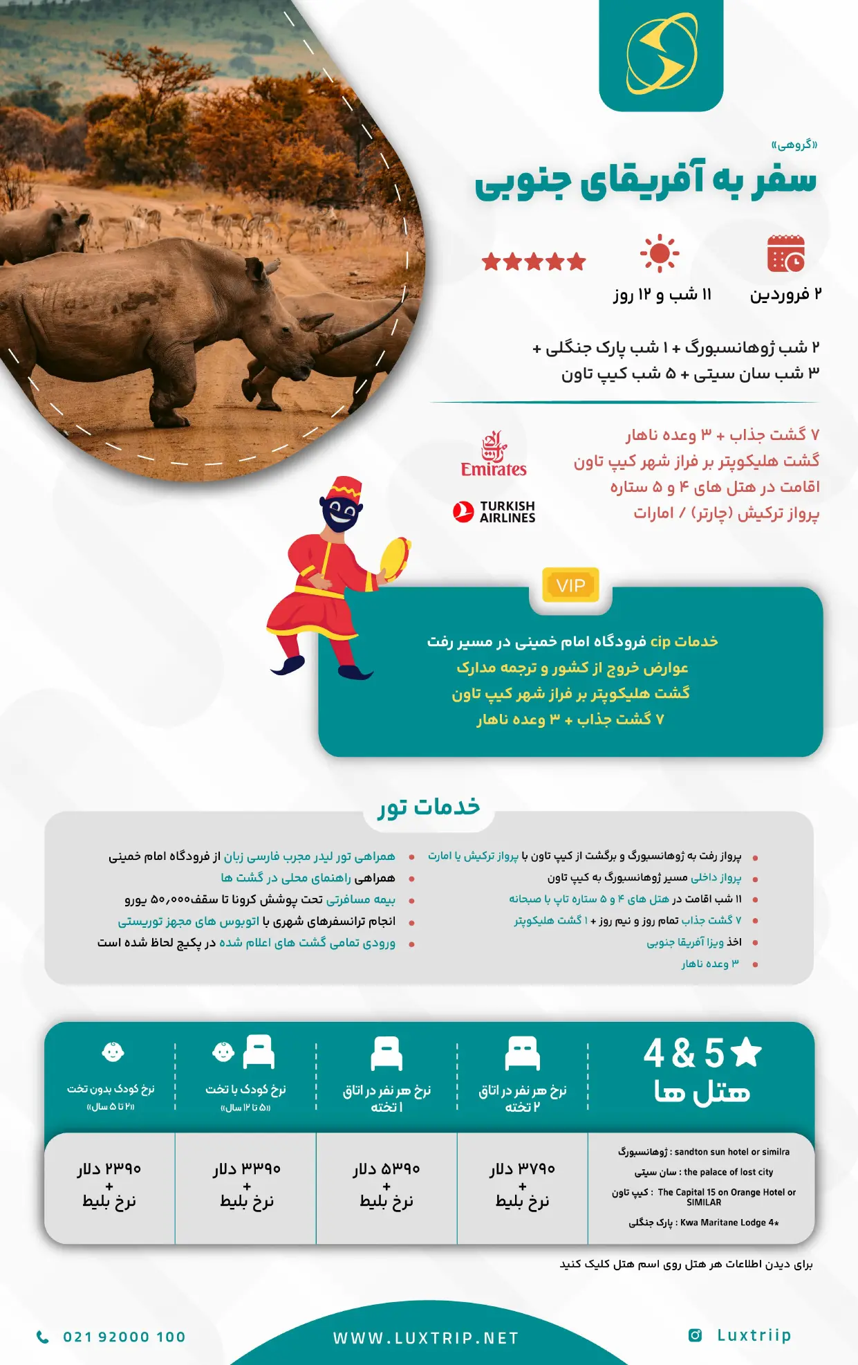 پس از ده سال اجرای موفق این تور، شما را به سفری بی‌رقیب دعوت می‌کنیم. جایی که سافاری و حیات‌وحش آغاز هیجان و با غروب‌ کیپ‌تاون و تلاقی دو اقیانوس به اوج می‌رسد. آفریقای جنوبی ترکیبی بی‌نظیر از ماجراجویی، فرهنگ رنگین و لوکس‌ترین لحظات است.