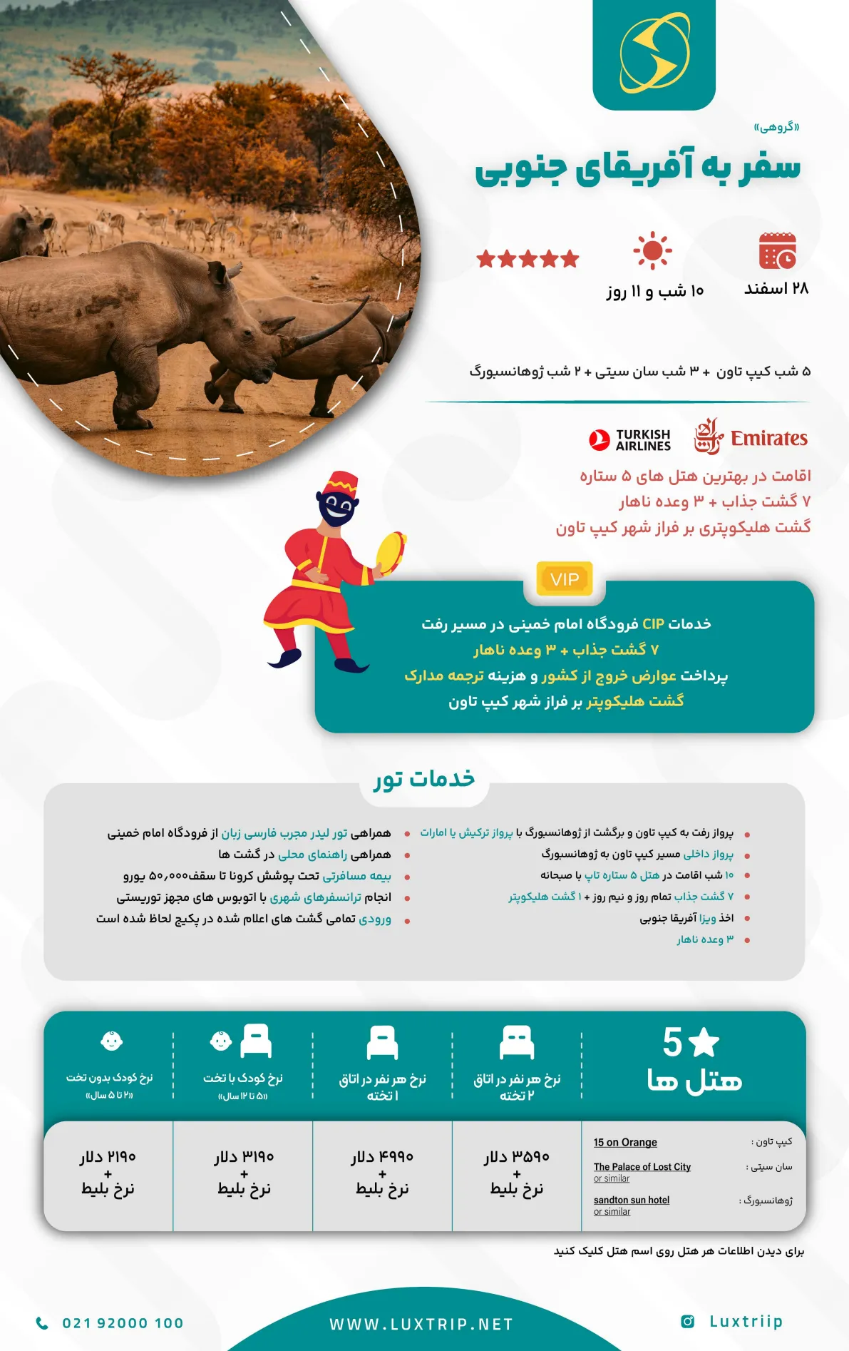 5 شب کیپ تاون + 3 شب سان سیتی + 2 شب ژوهانسبورگ