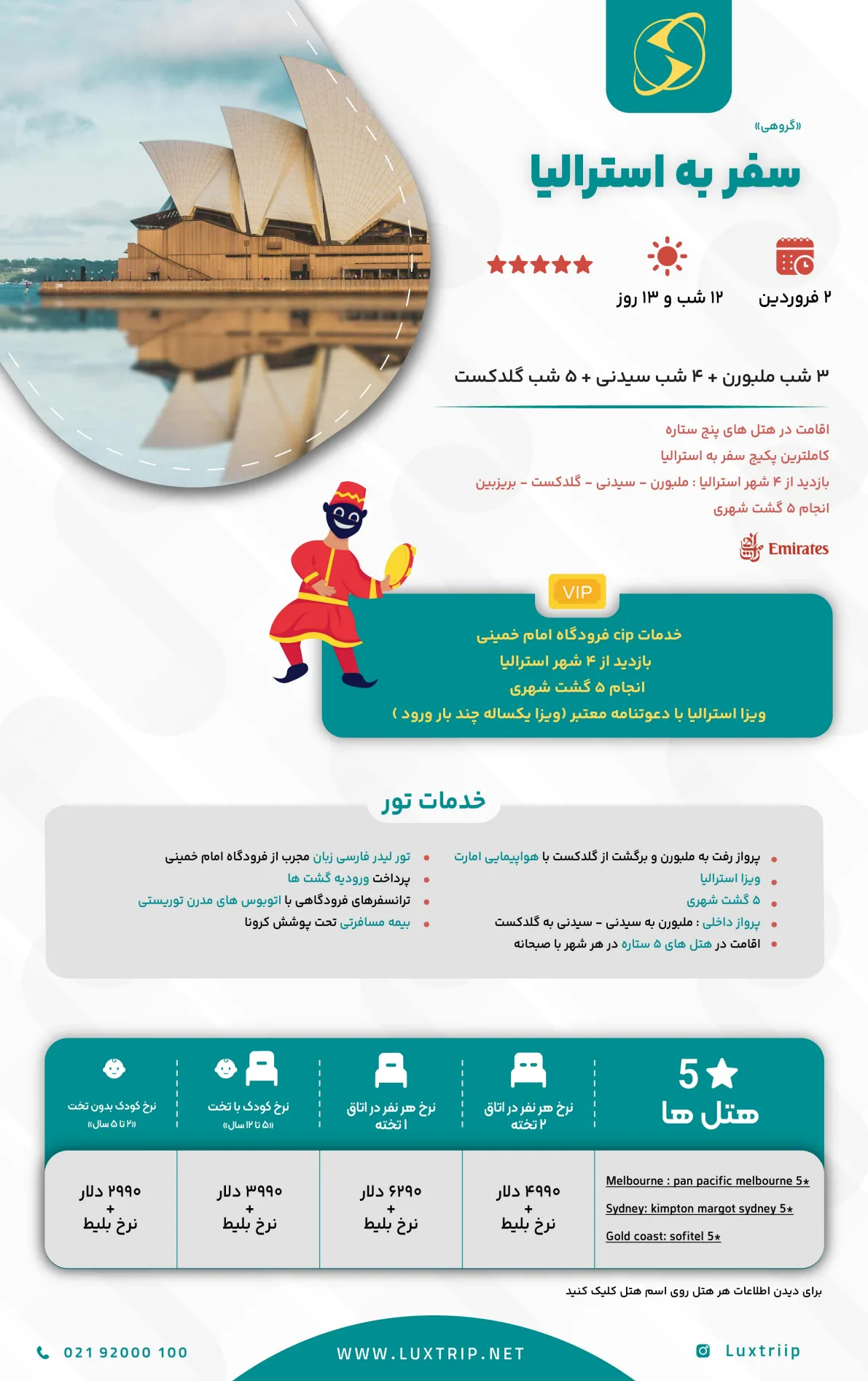 از بندر سیدنی و خانه اپرای باشکوه، تا طبیعت بکر پارک‌های ملی و صخره‌های مرجانی عظیم، هر لحظه تجربه‌ای تازه و فراموش‌نشدنی خواهد بود.