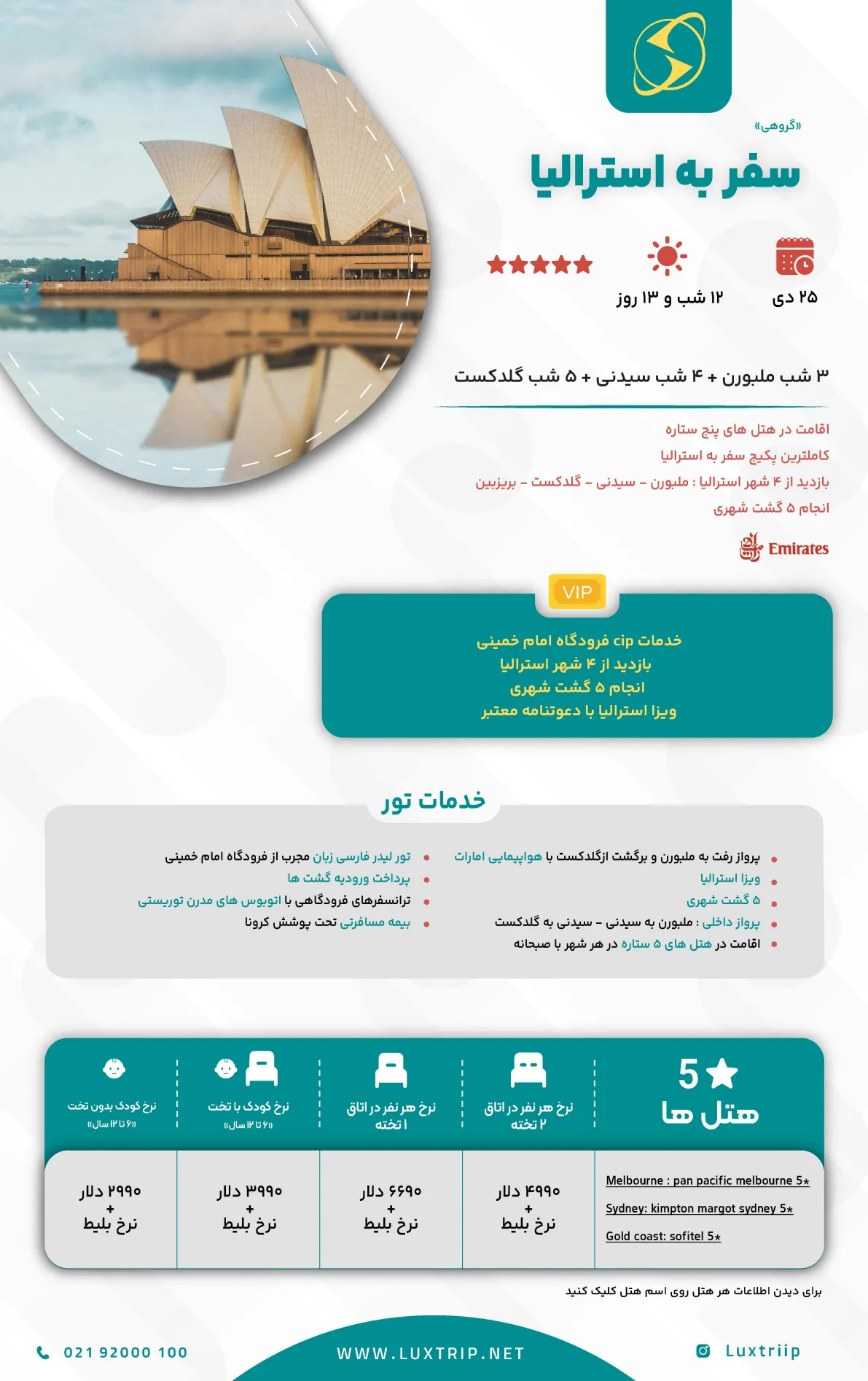 از بندر سیدنی و خانه اپرای باشکوه، تا طبیعت بکر پارکهای ملی و صخرههای مرجانی عظیم، هر لحظه تجربهای تازه و فراموشنشدنی خواهد بود.