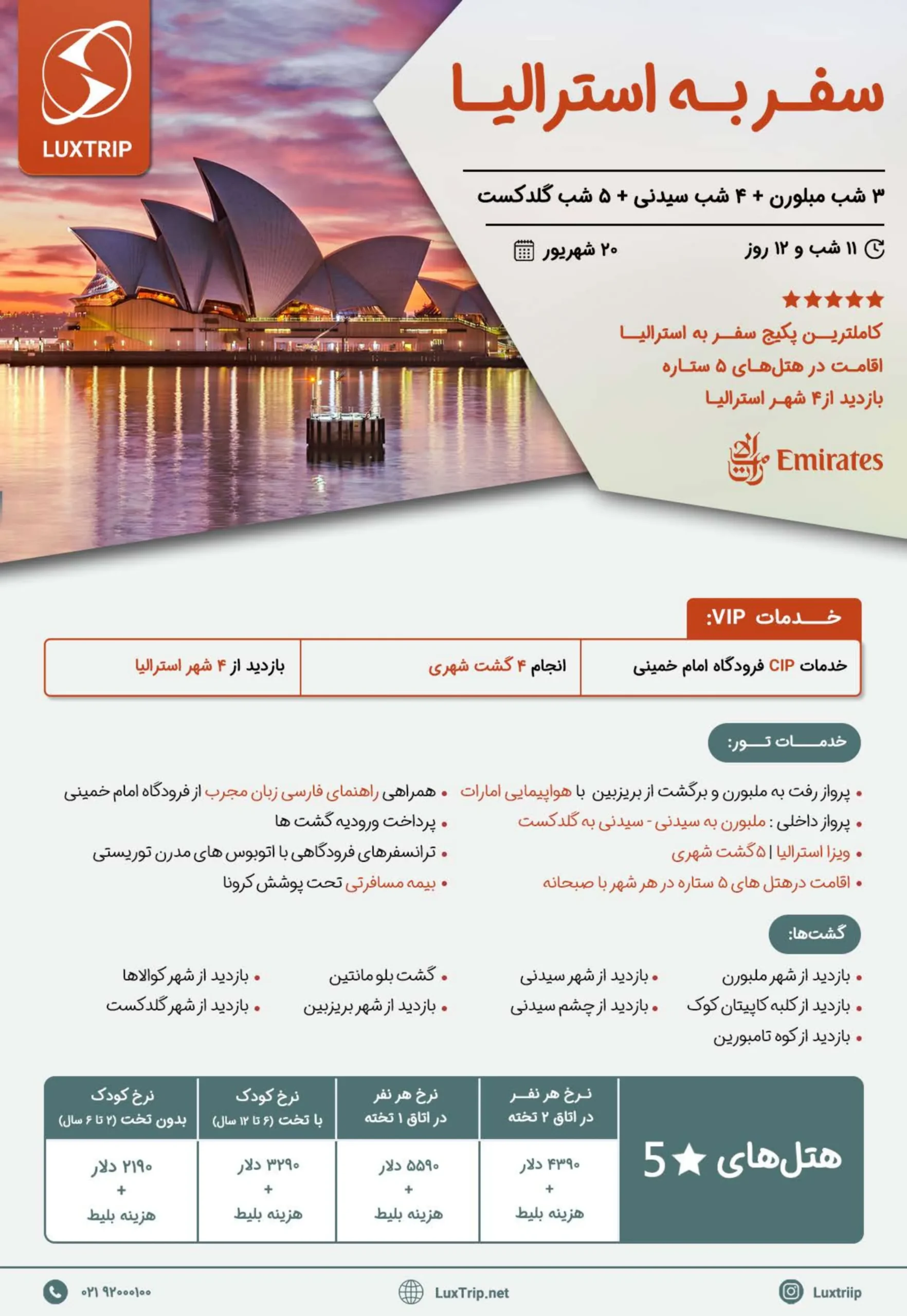 بعد از صرف صبحانه، خروج از هتل، حرکت به سمت فرودگاه جهت پرواز به شهر سیدنی، انجام ترانسفر فرودگاهی ورود به هتل و تحویل اتاق ها