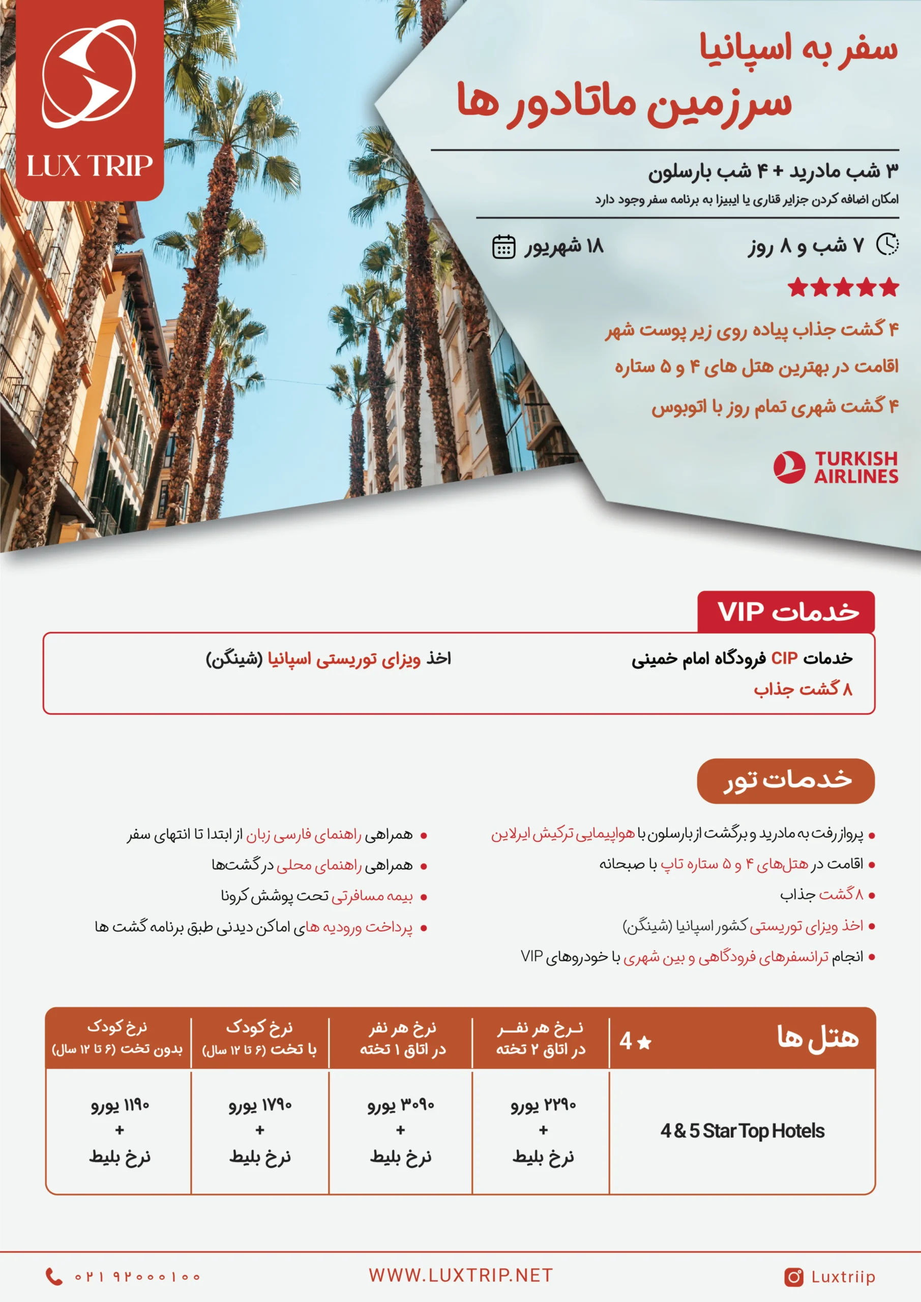 صرف صبحانه و گشت شهری بارسلونا شامل بازدید از نمای استادیوم "کمپ نو" و شهرک پارک زیبای گوئل سپس برگشت به هتل و بعد از استراحتی کوتاه گشت اختیاری شو معروف و اصیل "فلامنکو"