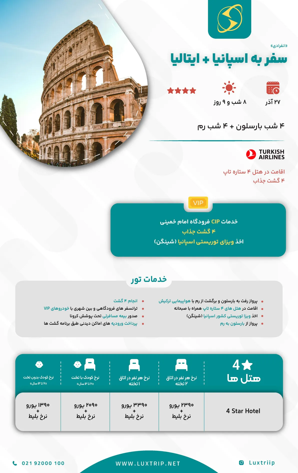 آنچه در این سفر تجربه میکنید، از خیابانهای پرشور بارسلونا و معماری خیرهکننده گائودی، تا رم تاریخی و میدانهای جاودانه ایتالیا