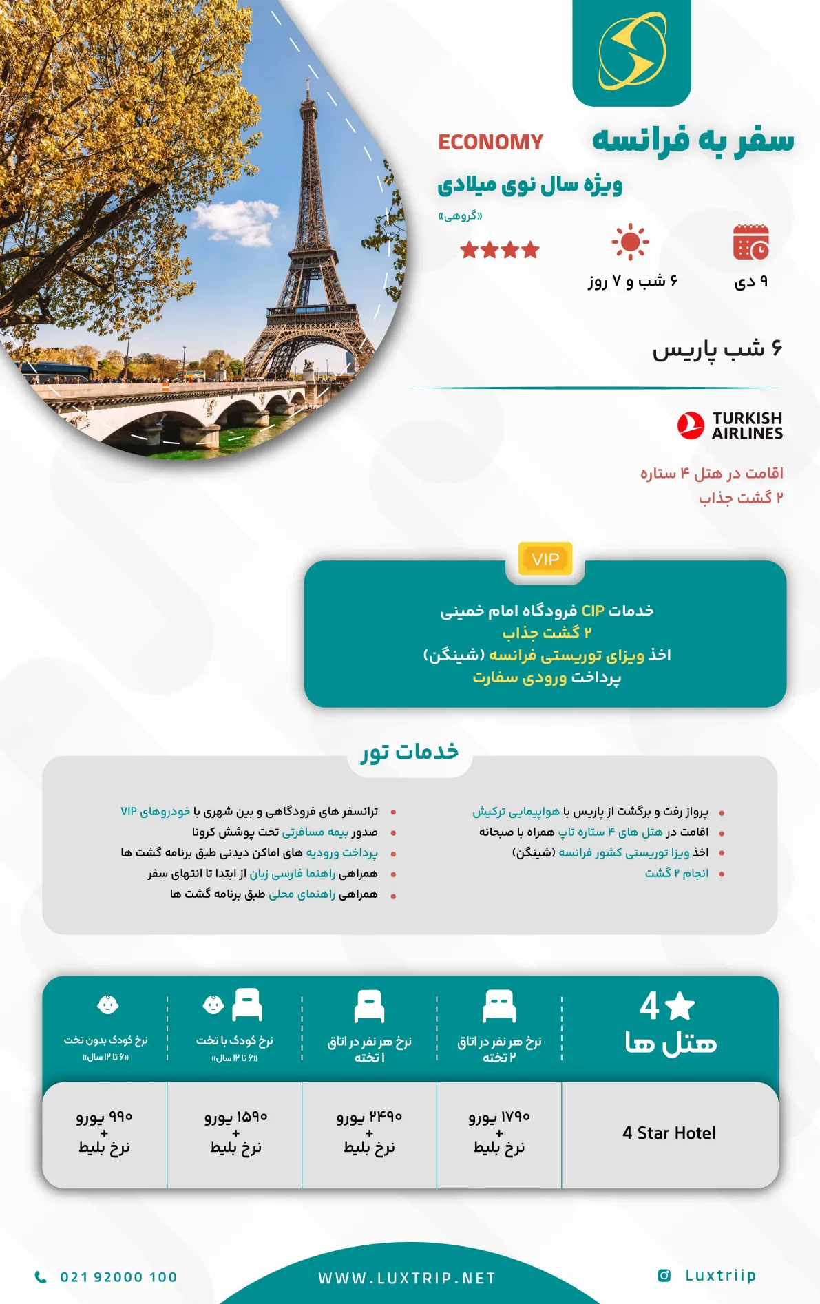 نرخ اتاق 1 تخته ٢4٩٠ یورو +. نرخ بلیط