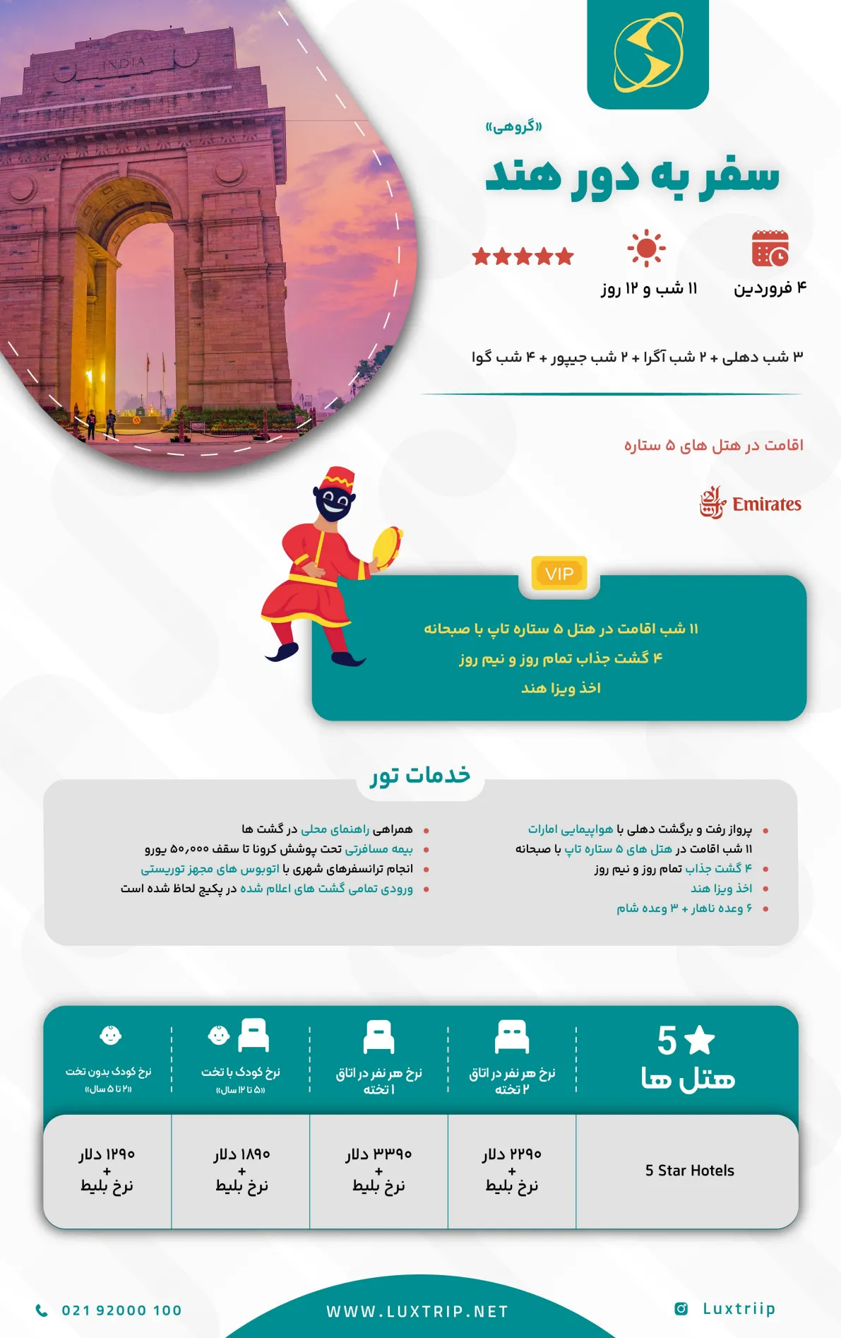 آژانس ستاره ولنجک شما را به سفری تماشایی در دور هند دعوت می‌کند؛ مسیری که با تاریخ، رنگ و آرامش در چهار چهره متفاوت از این سرزمین شگفت‌انگیز همراه می‌شود. از پایتخت پرهیجان دهلی با بناهای تاریخی و بازارهای رنگارنگ، تا شکوه بی‌بدیل تاج‌محل در آگرا؛ سپس ورود به جیپور، شهر صورتی هند، با کاخ‌ها و قلعه‌های باشکوه راجستان.در پایان، این سفر با آرامش سواحل طلایی و شب‌های پرشور گوا کامل می‌شود؛ جایی که دریا، موسیقی و سبک زندگی ساحلی، تجربه‌ای متفاوت و فراموش‌نشدنی برایتان رقم می‌زند. تور دور هند، آمیزه‌ای از فرهنگ، تاریخ، طبیعت و آرامش است؛ سفری که هر فصلش رنگی تازه دارد و هر لحظه‌اش ارزش تجربه کردن.