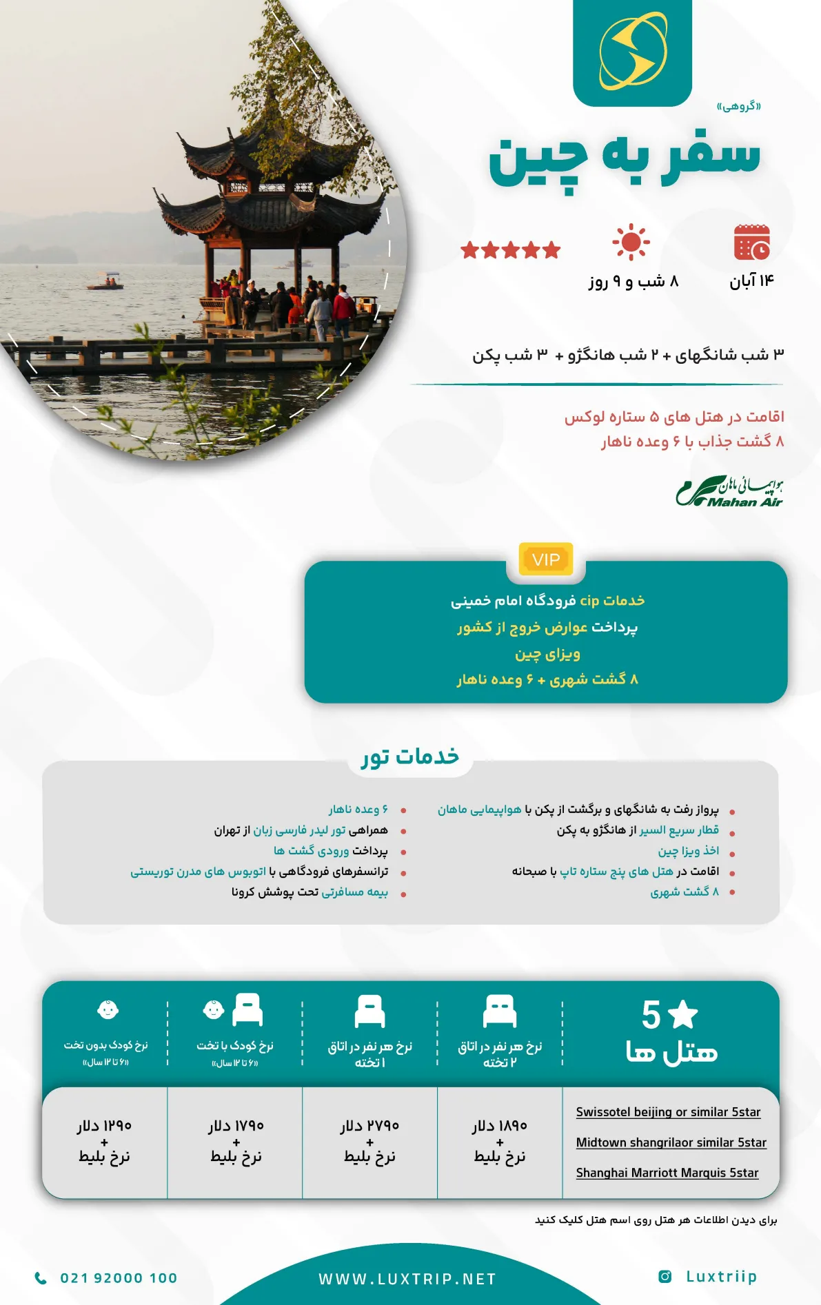 از شکوه دیوار بزرگ و شهر ممنوعه در پکن، تا آسمانخراشهای مدرن شانگهای و اقامت در هانگژو با دریاچهی افسانهای «غربی»، همهچیز برای شگفتزدهشدن شما مهیاست.