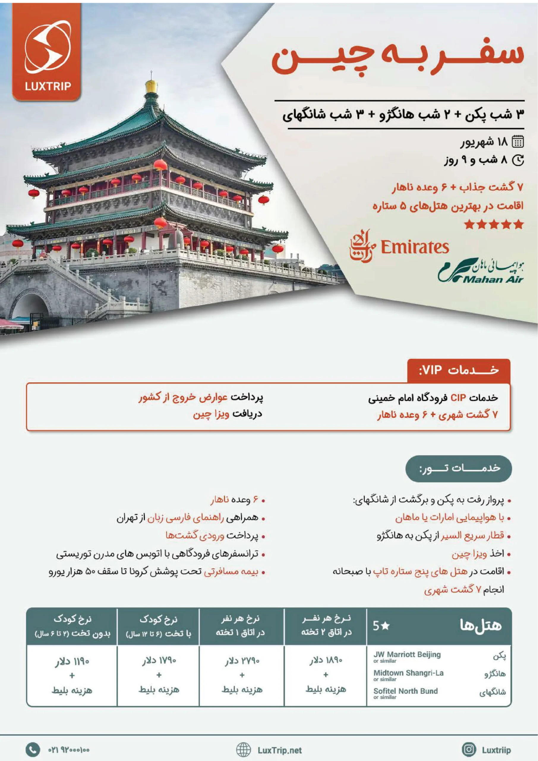 3 شب پکن + 2 شب هانگژو + 3 شب شانگهای