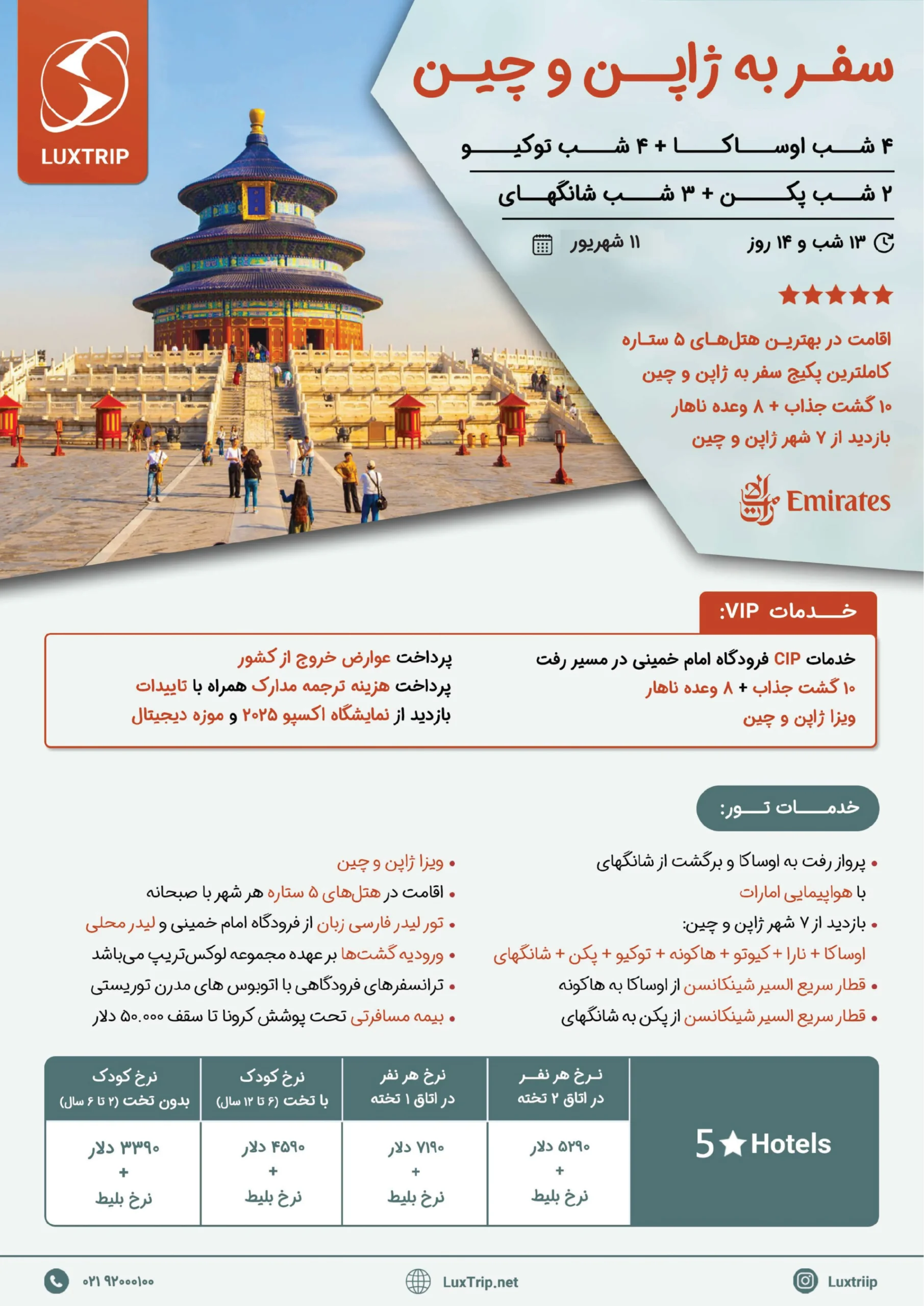 بعد از صرف صبحانه، خروج از هتل و پرواز به پکن، انجام ترانسفر فرودگاهی به هتل و تحویل اتاق سپس انجام گشت تمام روز بازدید از شهر پکن شامل بازدید از شهر ممنوعه، بازدید از میدان تیان آنمن و بازگشت به هتل