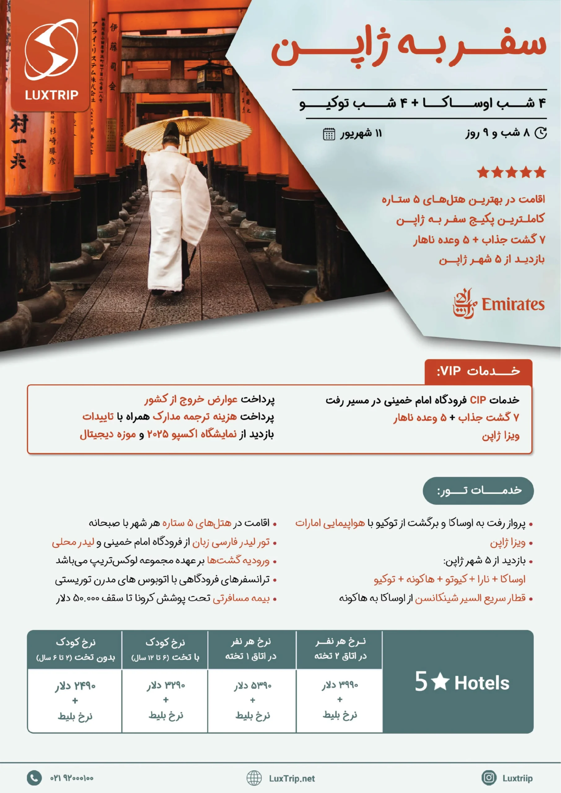 بعد از صرف صبحانه، بازدید از محوطه بیرونی قصر امپراطوری، بازدید از منطقه آزاکوزا و معبد سنسوجی و خیابان ناکامیسه و صرف ناهار و سپس بازدید از برج اسکای تری و بازدید از چهارراه شیبویا و بازگشت به هتل
