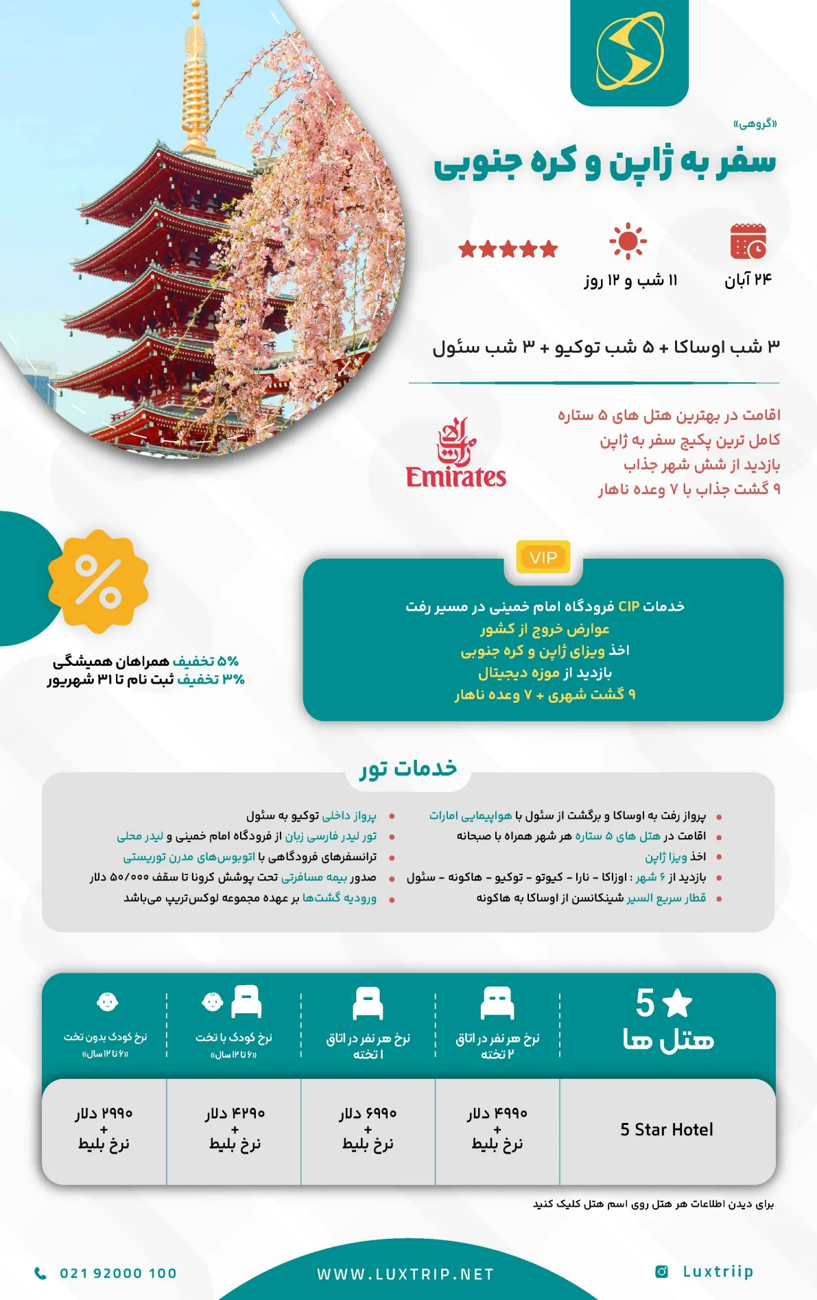 نرخ کودک (بدون تخت) 990 دلار + هزینه بلیط
