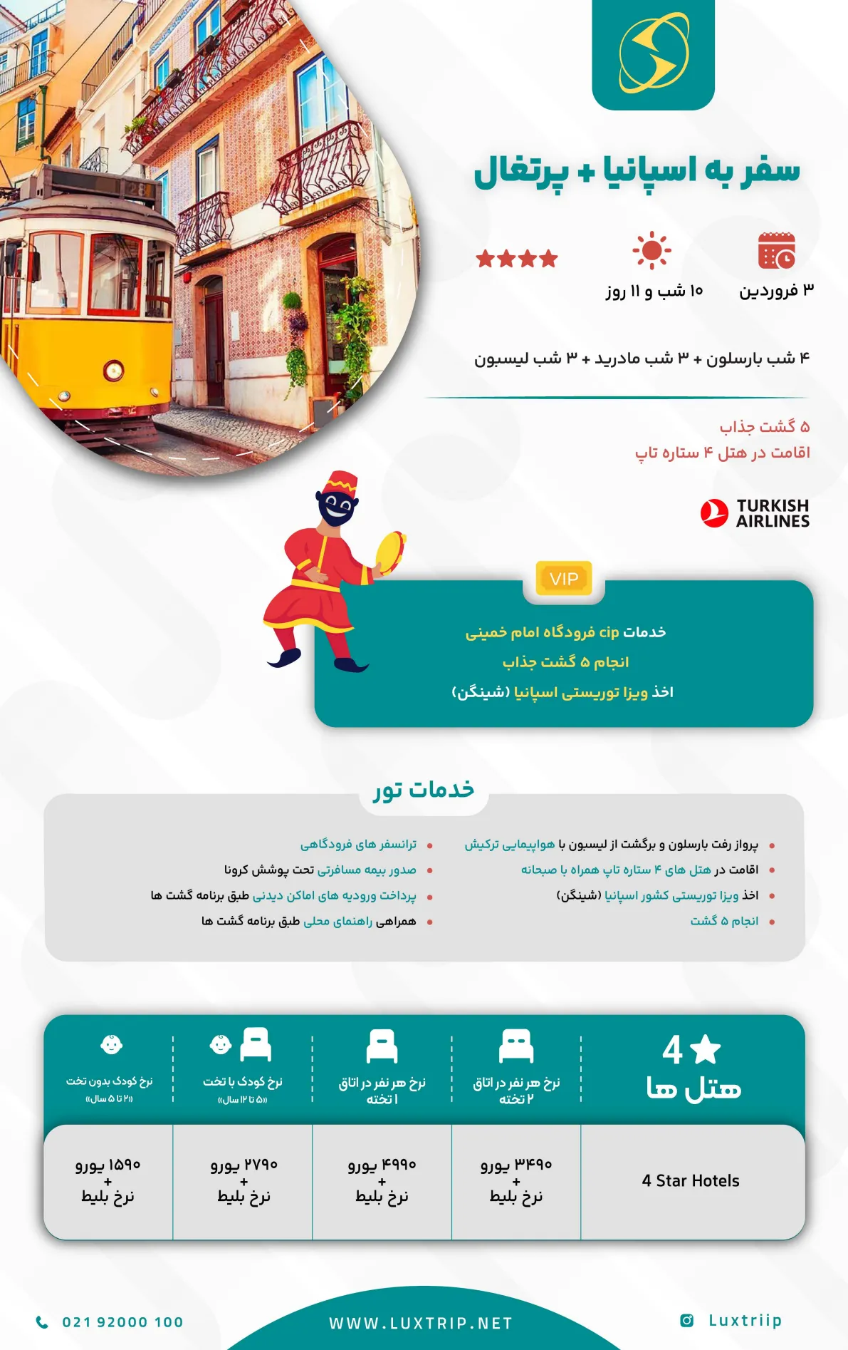 ستاره ولنجک شما را به سفری متفاوت در قلب جنوب اروپا دعوت میکند؛ تماشای سه چهره زنده و پرشور از فرهنگ و زندگی. از معماری شگفتانگیز بارسلونا و خیابانهای پرانرژی آن، تا شکوه تاریخی و میدانهای زنده مادرید، و در نهایت کوچههای شاعرانه و غروبهای طلایی لیسبون در کنار اقیانوس. این سفر، آمیزهای از هنر، موسیقی، فرهنگ و زندگی شبانه است؛ تجربهای پررنگ و ماندگار که هر لحظهاش به خاطرهای خاص تبدیل میشود.
