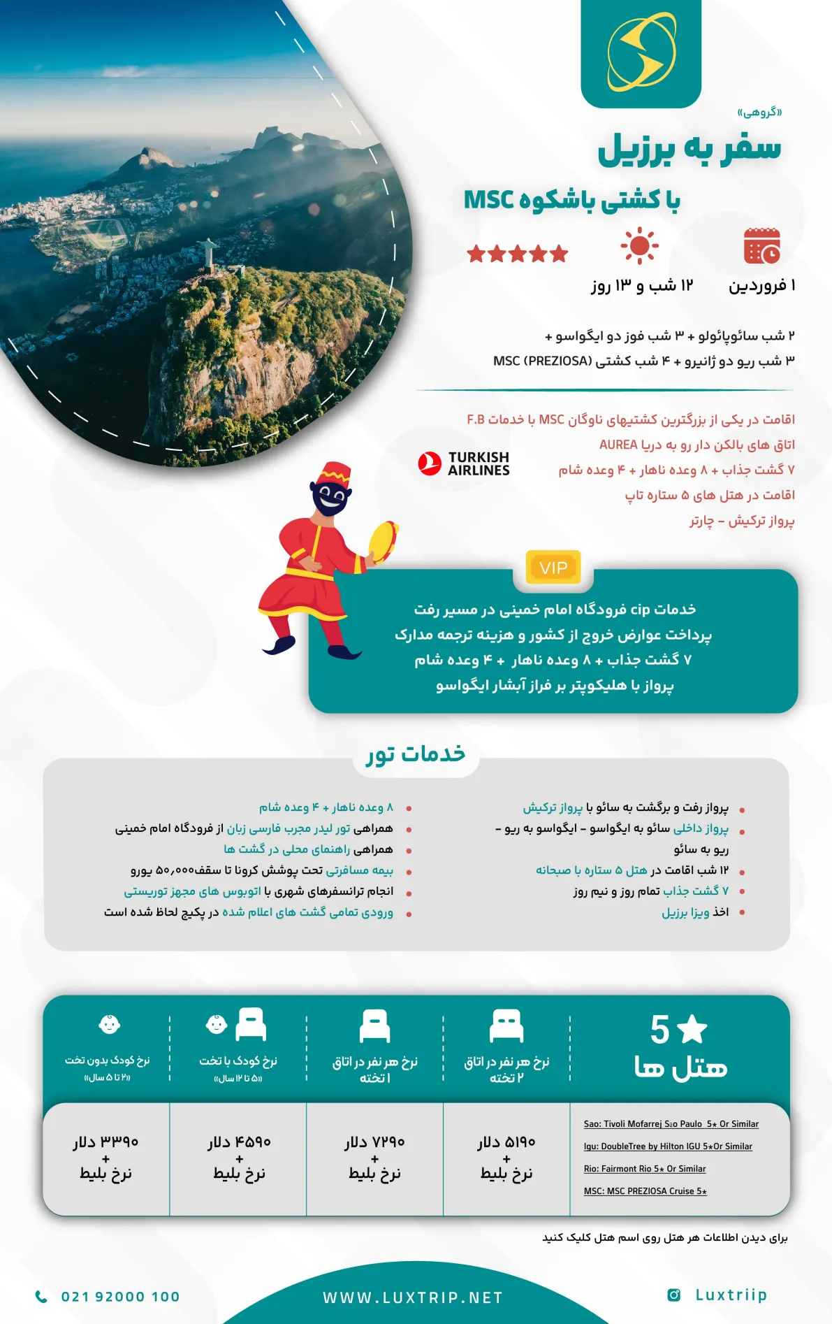 2 شب سائوپائولو - 3 شب فوز دو ایگواسو - 3 شب ریو دو ژانیرو + 4 شب کشتی MSC (PREZIOSA). M