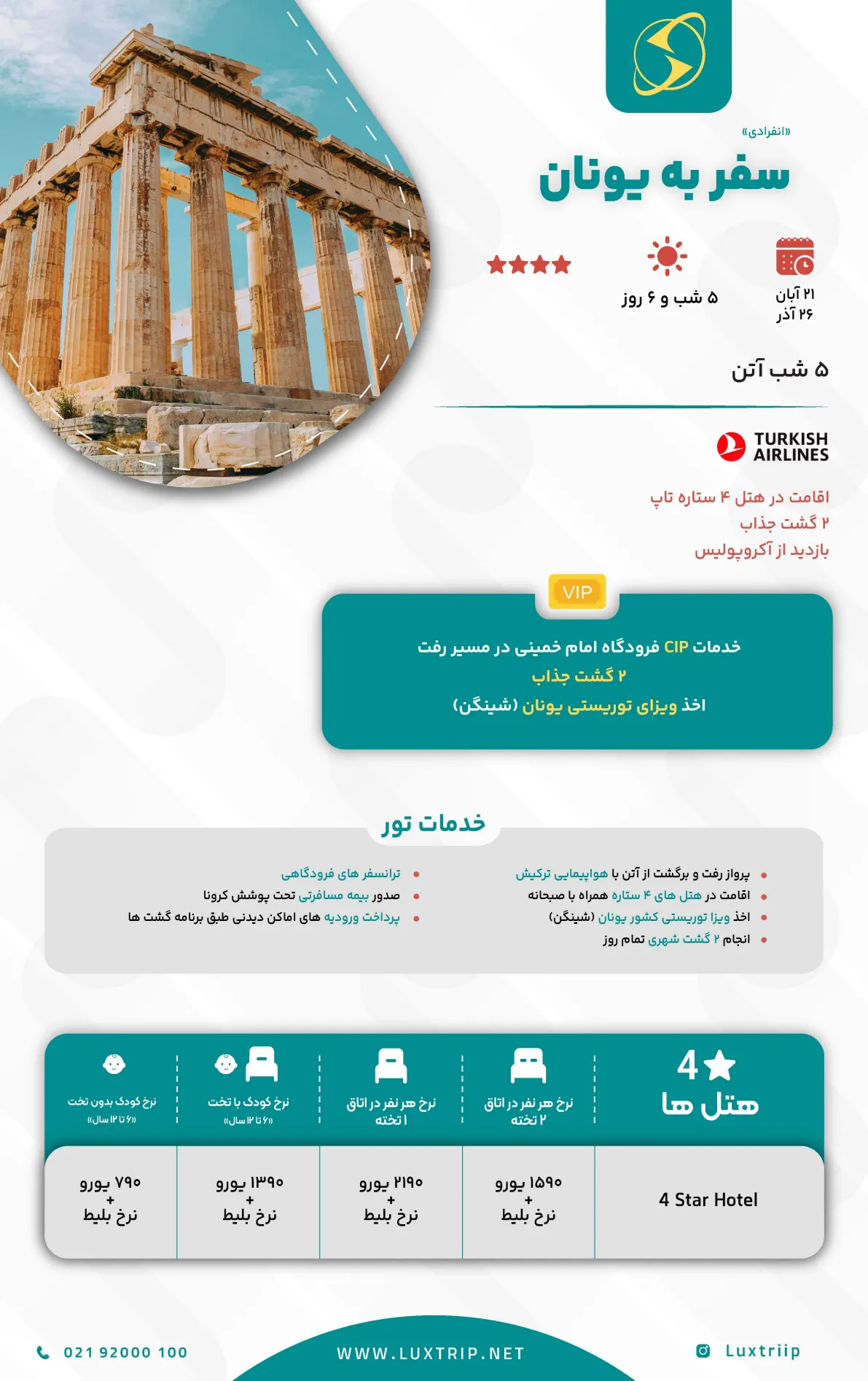 آنچه در این سفر تجربه میکنید، شکوه جاودانهی آتن است؛ شهری که معابد باستانی آکروپولیس، میدانهای تاریخی و کوچههای زندهاش روایتگر هزاران سال تاریخ و فرهنگ هستند.