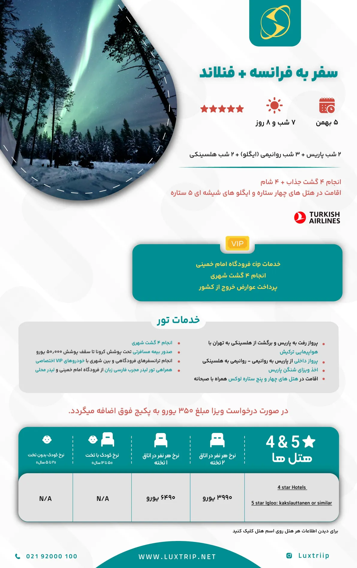 2 شب پاریس + 3 شب روانیمی (ایگلو) + 2 شب هلسینکی