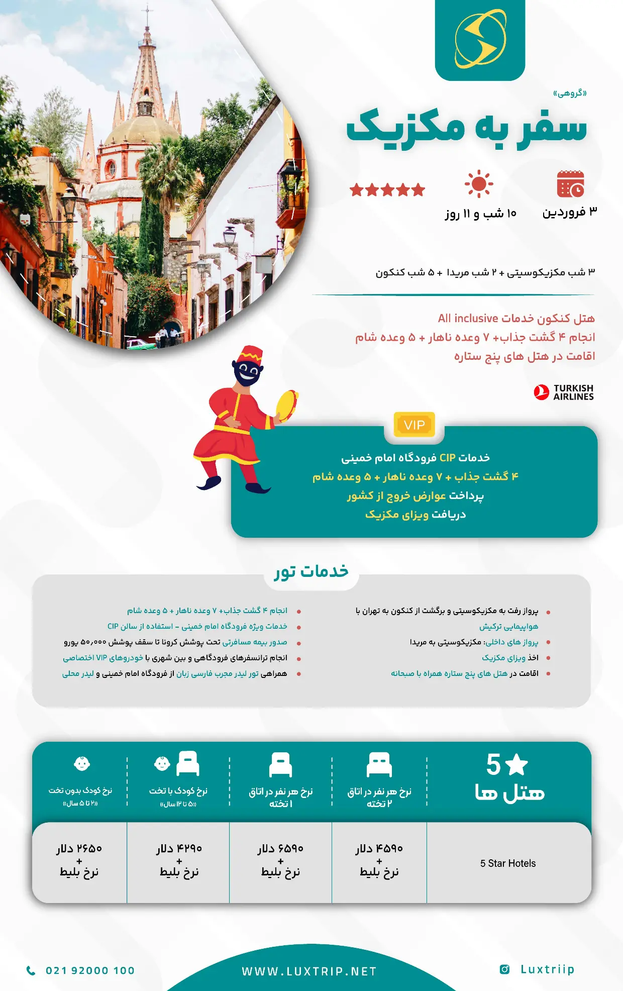 این سفر، شما را با سه چهره متفاوت و شگفتانگیز از مکزیک آشنا میکند؛ از مکزیکوسیتی، شهری پرانرژی با تاریخ غنی، موزههای مشهور و فرهنگ زنده، تا سواحل سفید و آبهای فیروزهای کنکون که نماد آرامش و تفریحات لوکس کارائیب است. در ادامه، تولوم با ویرانههای اسرارآمیز تمدن مایا در کنار دریا، طبیعت بکر و فضای خاصش، روحی متفاوت به سفر میبخشد. این تور، تلفیقی کمنظیر از تاریخ، ساحل و ماجراجویی است؛ تجربهای که مکزیک را عمیق، زیبا و فراموشنشدنی نشان میدهد